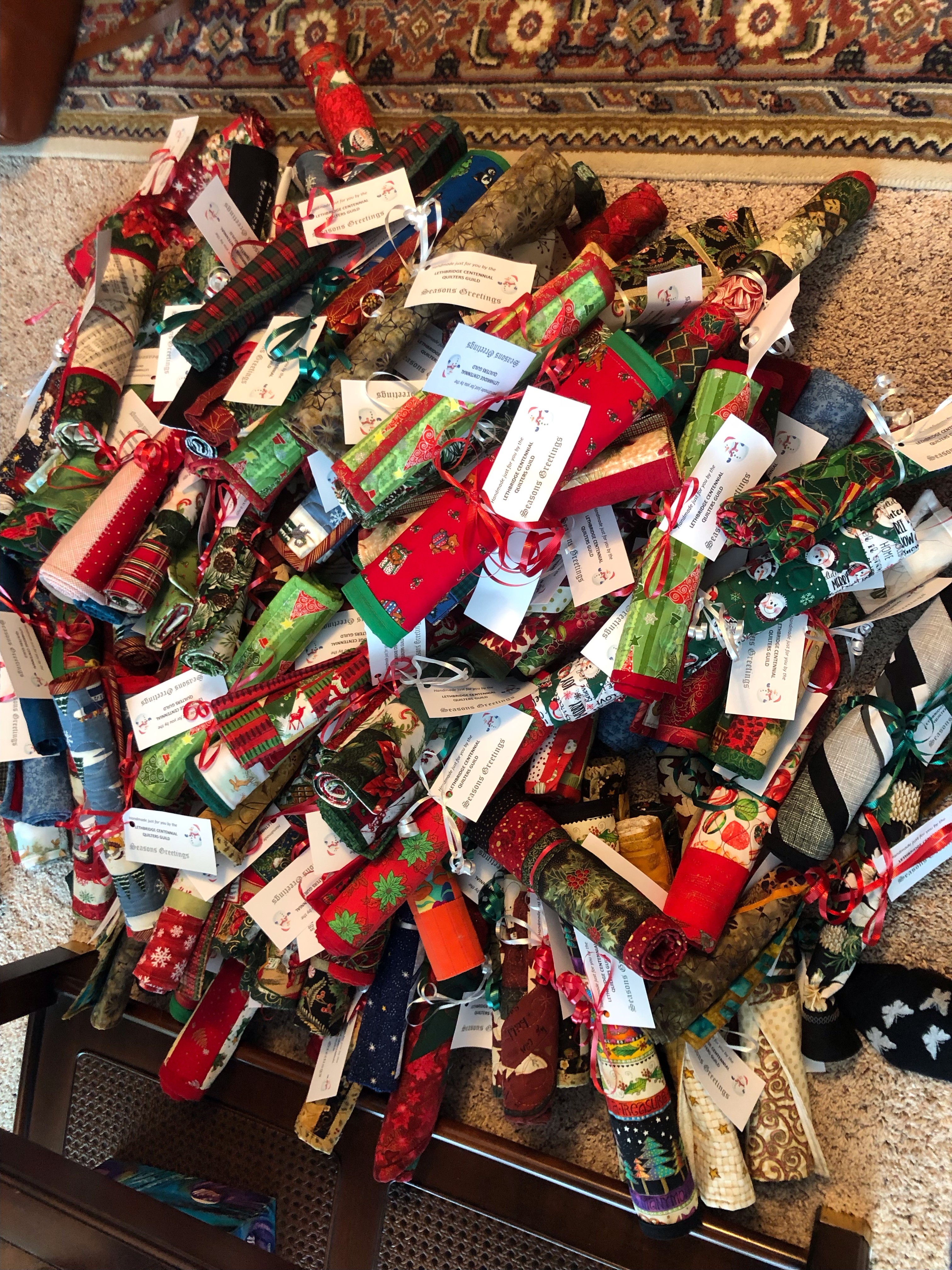 Way to go LCQG Community Quilts Program for making so many Christmas placemats! The committee rolled and tied up with curly ribbon and a gift tag on 150 beautiful placemats made for Meals on Wheels recipients to accompany their Christmas dinners. Placemats will be given not only within the city of Lethbridge but also in Picture Butte, Raymond and Coaldale.
