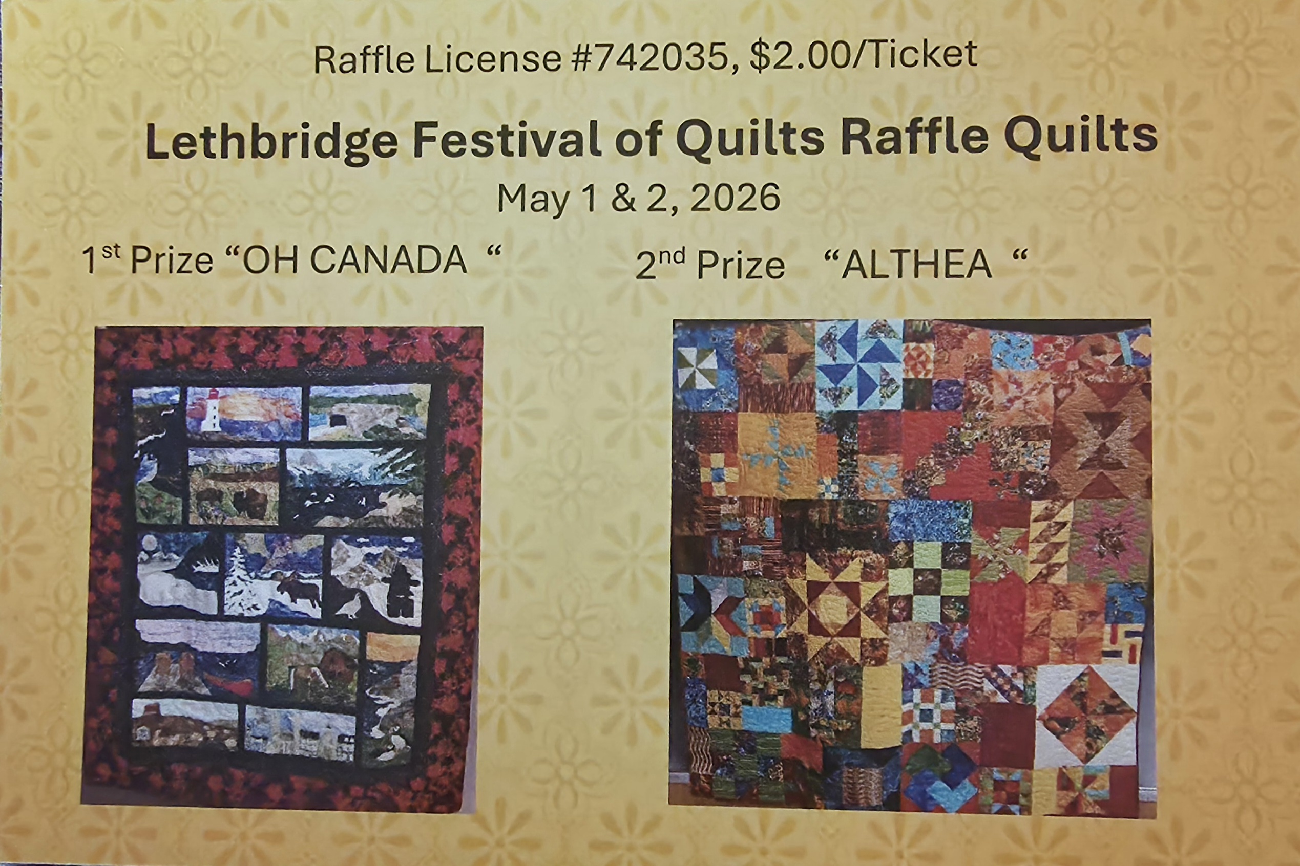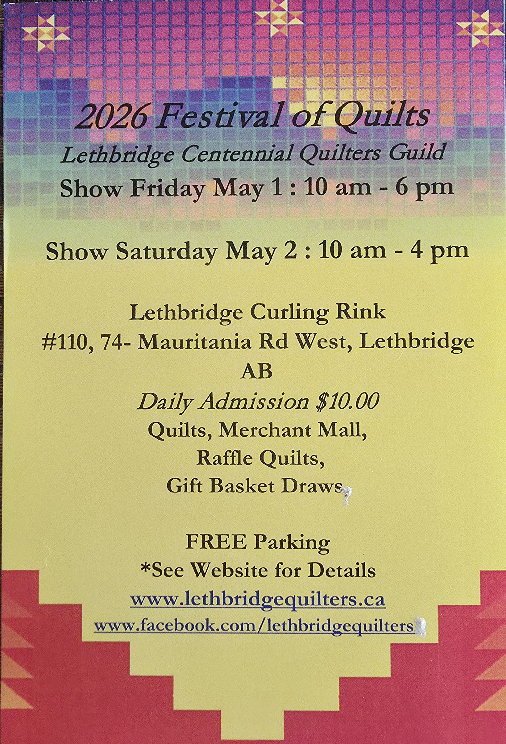 ♦ Quilt entry registrations are now closed. Thankyou for your entries, it’s going to be a fantastic show! Intake for your quilt entries will be received in person only between 9:30am -12 noon, on Thursday April 30th, at the Lethbridge Curling Club, Mauritania Road, West Lethbridge. After the show is over, quilts must be picked up in person, between 5:30pm – 9pm on Saturday May 2nd.